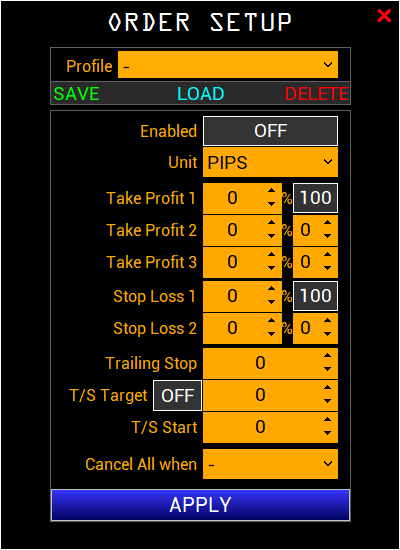 Über die rechte Seite des Moduls lassen sich Schutz- und Folgeorders konfigurieren. Zu den wichtigsten Parametern gehören Enabled, Unit, Cancel All when, Stop Loss, Take Profit, Trailing Stop und T/S Target.