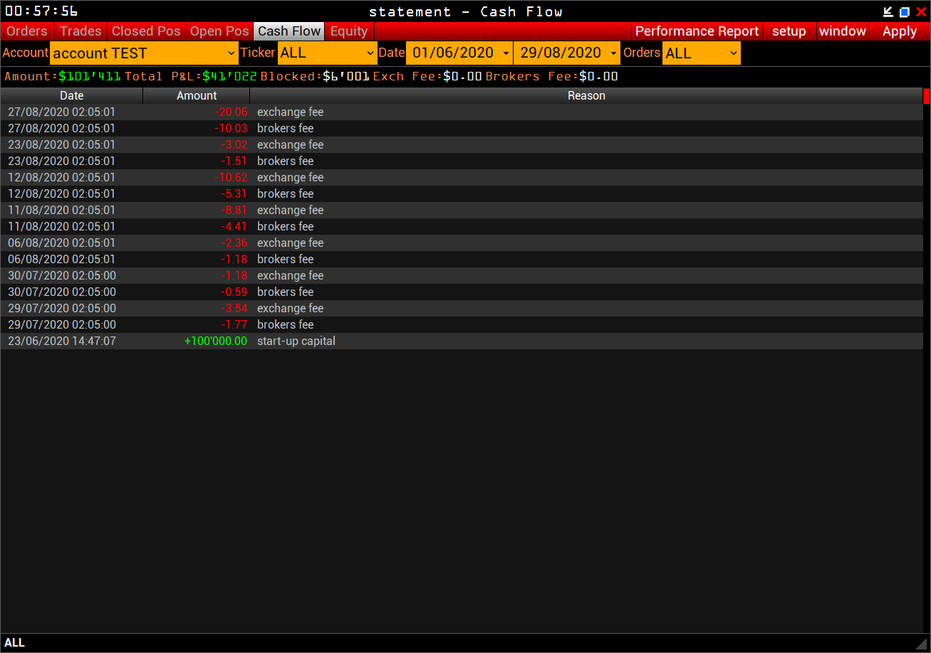 Cash Flow - zeigt die Historie der Geldbewegungen auf dem account mit Filterung nach account, ticker, Datum und order type an.