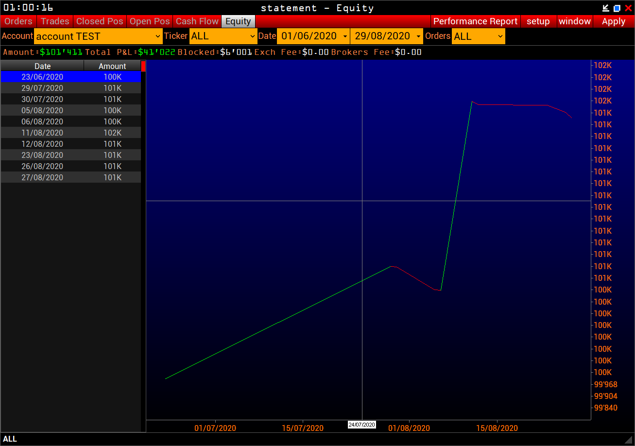 Equity - zeigt die Historie der Veränderungen des Kontostands als Grafik mit Filterung nach account, ticker, Datum und order type an.