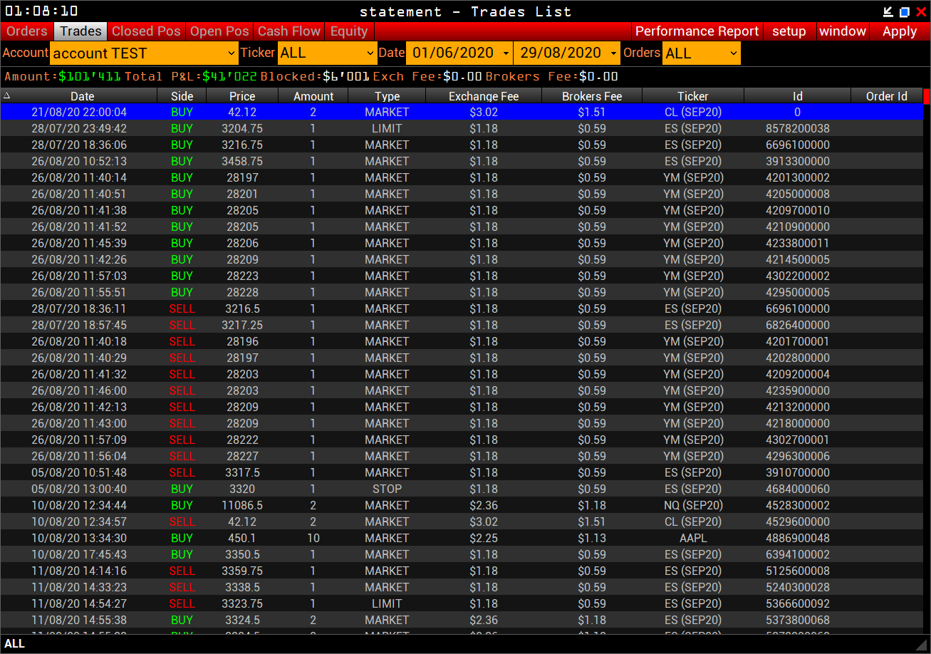 - Closed Pos mostra la cronologia di ogni trade chiuso con la possibilità di filtrare i dati per account, ticker, data e order type.
